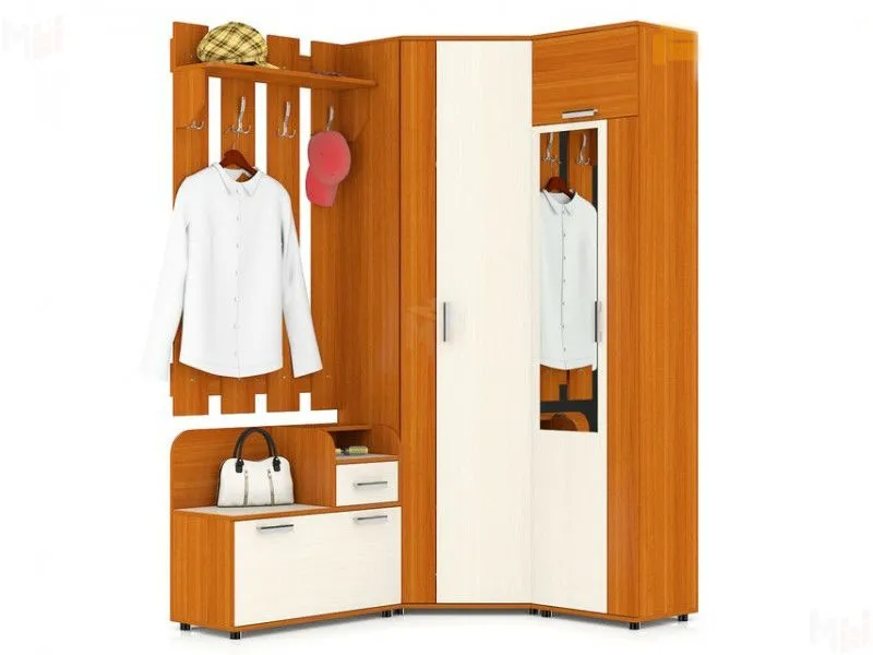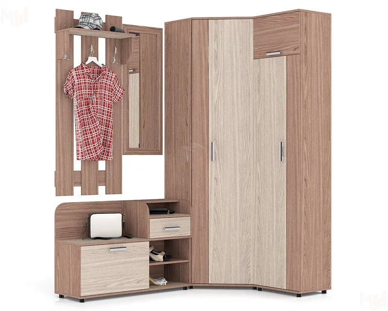 Прихожая с угловым шкафом изготовлена из из ЛДСП, кромка ABS - 2 мм, кромка ABS - 0,4 мм. Состоит из четырех предметов. Сборка прихожей П-5 универсальная.