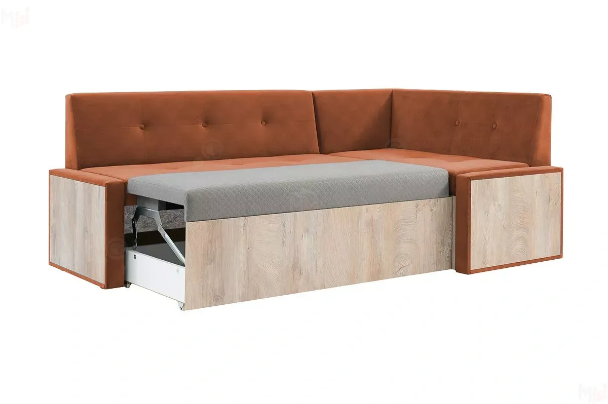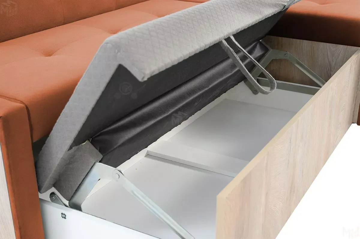 Стильная модель, оригинальность которой придают декоративные элементы на передней части дивана. За счет них диван не будет пачкаться, это сократит время на уборку и сохранит внешний вид мебели на многие годы. Невысокая спинка модели, глубокое посадочное место. Отсутствие подлокотников позволяет сэкономить пространство и получить большее посадочное и спальное место. Диван выполняется со спальным местом с трансформацией «дельфин», в угловой части предусмотрен большой выкатной вместительный бельевой ящик. По спинке и сиденью сделана прошивка и утяжка, что позволит материалу обивки дольше сохранить свой первоначальный вид. Большой выбор размеров, вариантов обивки и декоративных элементов ламинированной плиты с древесным, каменным или однотонным дизайном создадут эксклюзивный дизайн.