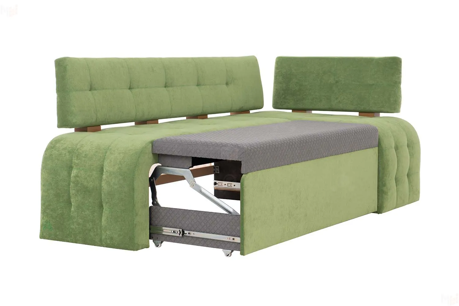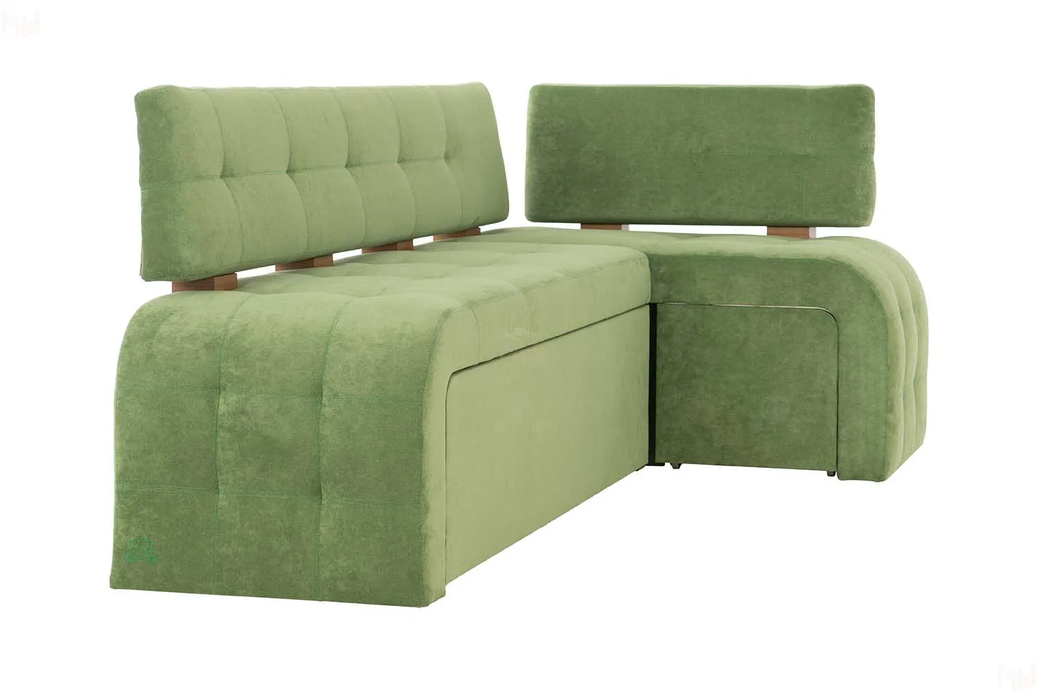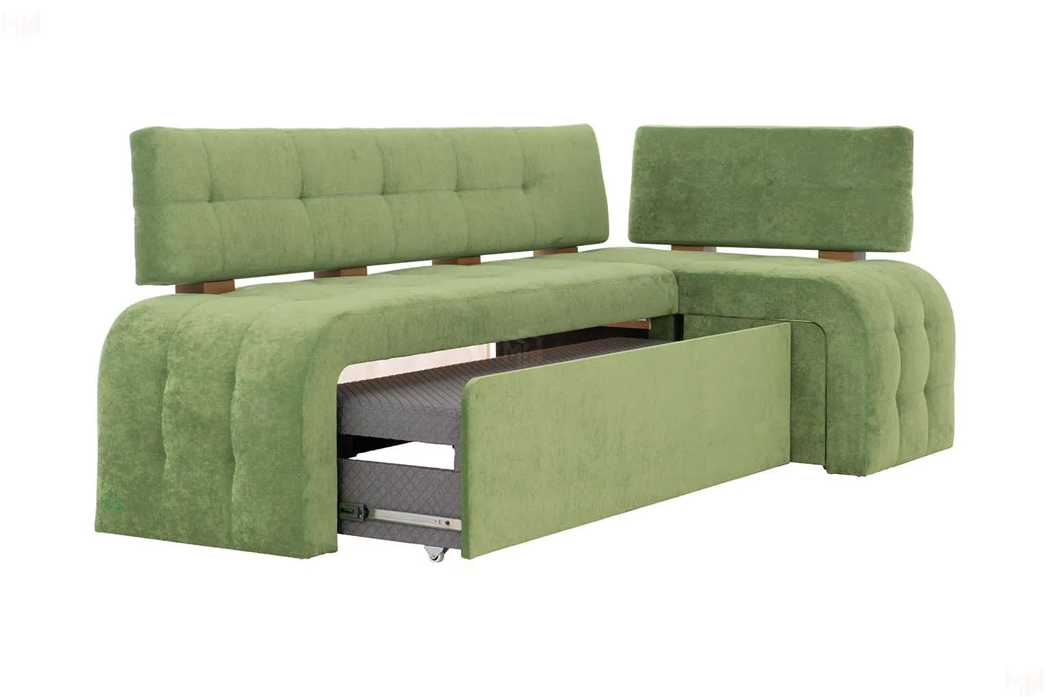 Стильный угловой диван, который прекрасно впишется в любой интерьер кухни. Основным достоинством, является компактность модели, глубина всего лишь 55 см. Невысокая, узкая спинка позволяет при всей компактности модели, сохранить удобное посадочное место. Диван достаточно функциональный, на выбор два варианта, раскладной, можно использовать как спальный вариант, механизм трансформации дельфин позволяет получить полноценное спальное место и не раскладной диван, под сиденьем располагается большой выкатной ящик. В кресельной части находится ящик для хранения вещей. Оригинальный дизайн модели дополняют декоративная двойная прострочка, а также вставки МДФ между спинкой и сиденьем.