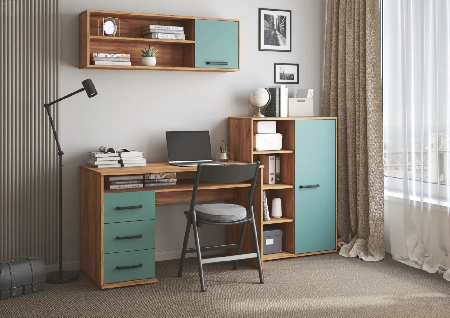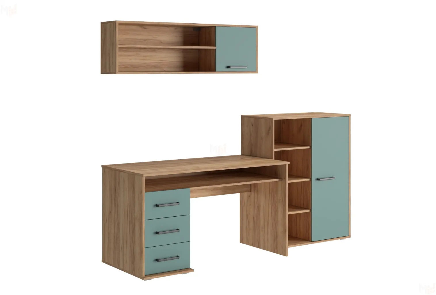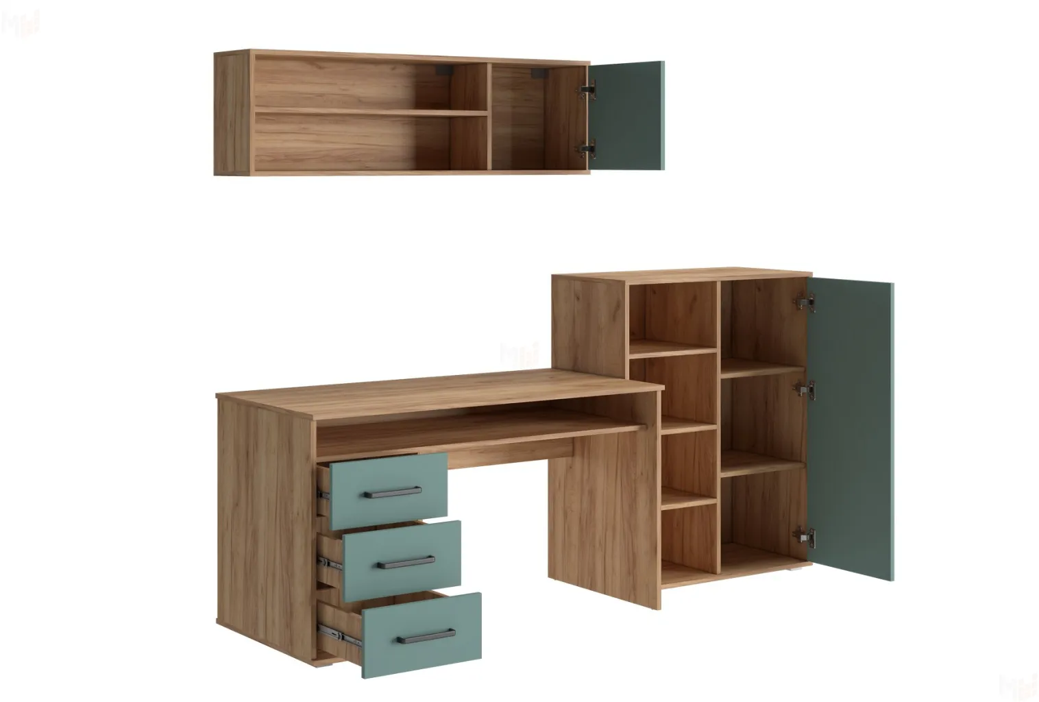 Дополнительным местом для хранения мелочей является верхняя закрытая полка, а рядом с ней на открытой полке можно расположить выставку достижений школьника. Во избежание нанесения травм, углы стола имеют скруглённые формы, поэтому он безопасен не только для подростков но и юным пользователям. Данная модель имеет возможность собираться как на левую, так и на правую сторону.