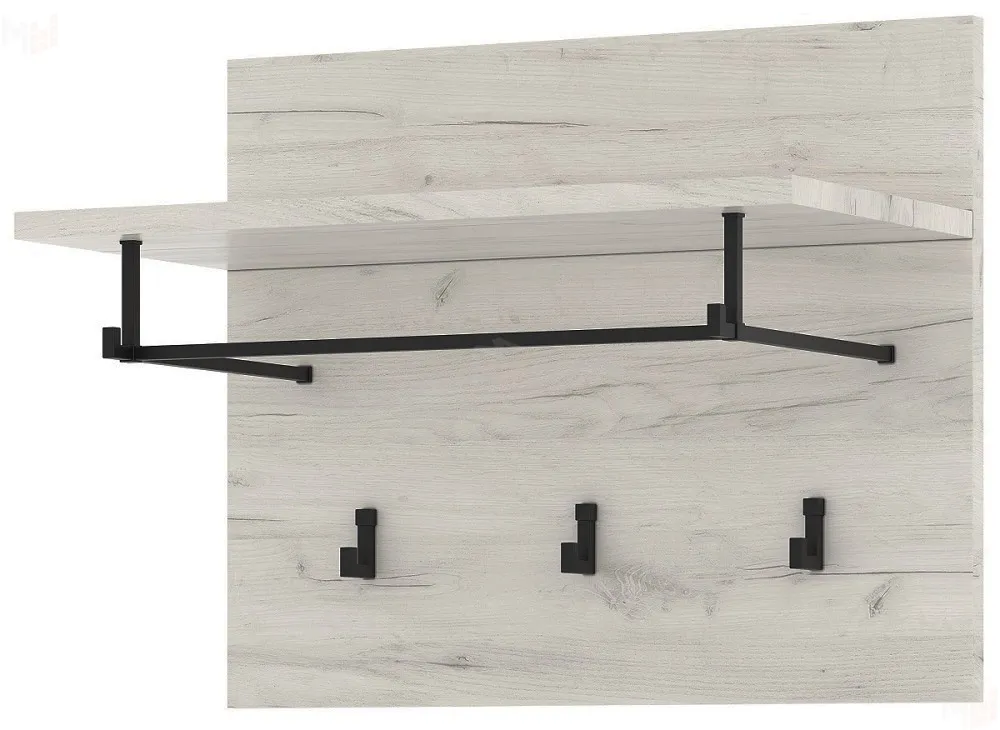Вешалка 500 ГРЕТТА с полкой навесная. Чёрные матовые металлические крючки и опора полки. Крепится к стене через навесные элементы.