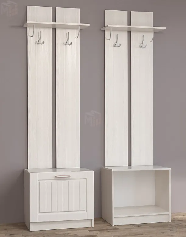 Модуль включает в себя тумбу для обуви с откидной дверкой и вешалку с двумя двойными крючками и антресольной полкой.
