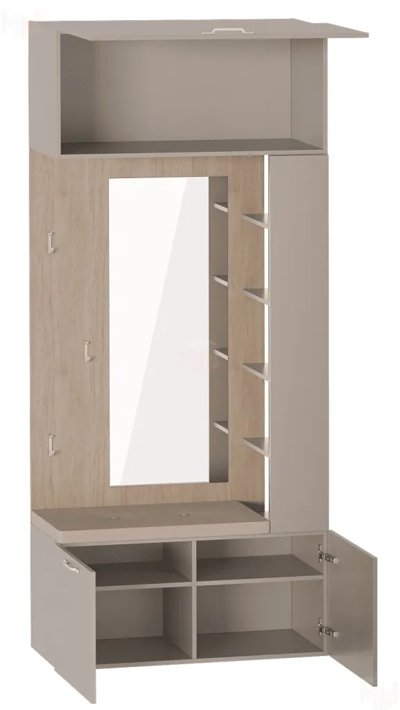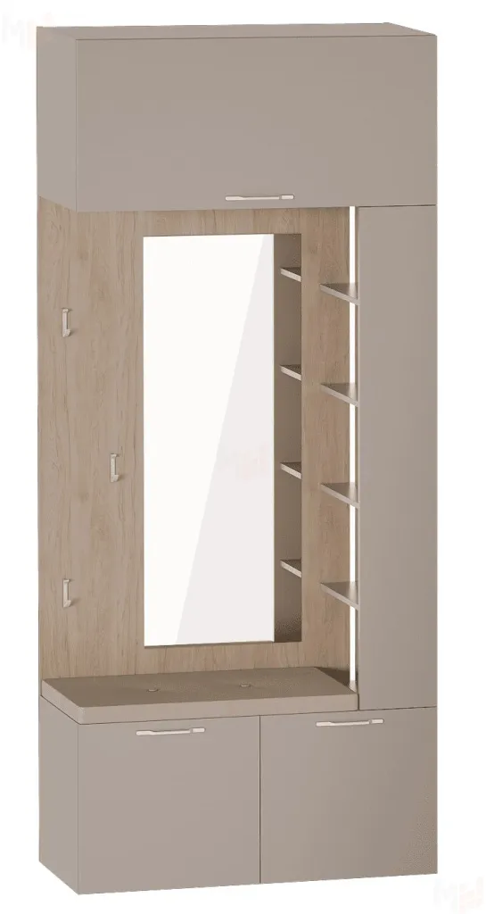 Модульная прихожая "ДЖЕРСИ", выполненная в современном стиле, придаст вашей прихожей красоту и функциональность. Модуль "Вешалка с зеркалом" выполнен из ЛДСП цвета Дуб натуральный светлый/Капучино.