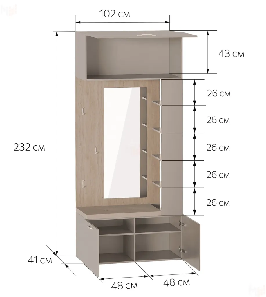Верхняя полка модуля имеет встроенный газлифт и позволит разместить объемный чемодан. Вертикальный ряд полок со светодиодной подсветкой выполнен на правую сторону, при желании можно распахнуть створку, прикрывающую ряд. Прочные крючки и ручки в форме скобы выполнены из белого матового металла. Все петли - плавного закрывания.