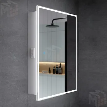 Сбоку шкафа встроена розетка с выключателем. Цветовая температура подсветки: 6500К. Тип выключателя сенсорный. Ширина светового поля 34 мм, шкаф-перевертыш. -
