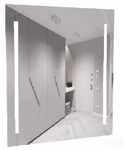 Размерный ряд зеркал от 40 см до 100 см в ширину. Начиная с 60 размера на зеркалах установлен сенсорный выключатель. До 50 размера включительно выключатель пластиковый и находится на корпусе.