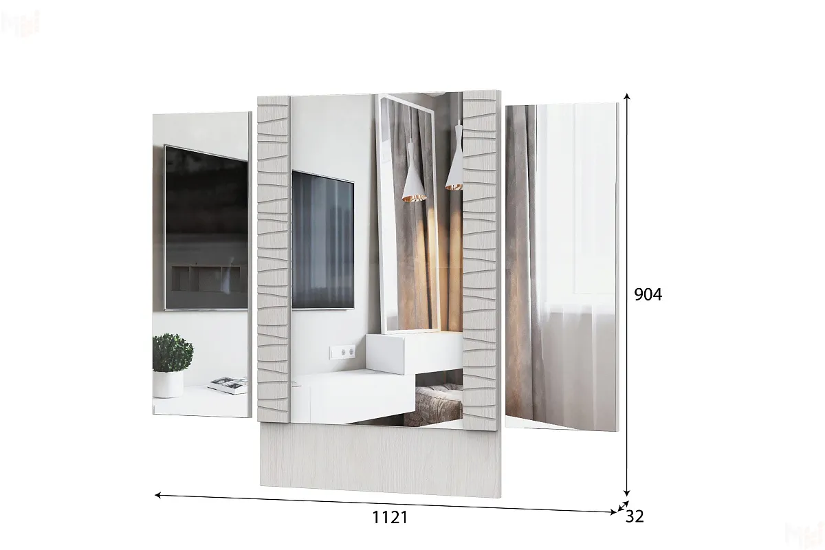 Модуль состоит из трех ЛДСП панелей к которым при сборке приклеиваются зеркала. Панели по краям поворачиваются на трельяжных петлях.